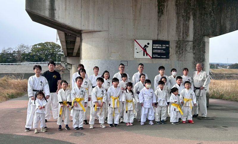 1月11日(日)山国川三口の河原で新春恒例の各支部合同寒稽古を行いました。前日まで比較的暖かい日が続いていましたが、当日の予報は早朝から雨→みぞれ→雪となっとおり、気温2~5℃、風速は4→8mと大荒れの模様!毎年楽しみにしている父が準備する猪の焼肉、尚也師範が前日から準備して当日私が味見だけする豚汁は今回見合せる事に決定!雪の状況によっては河川敷に降りられないため中止も視野にいれておりましたが、何とか決行する事ができました。とは言え過去一の状況でアゴの筋肉が硬直して挨拶もままならず何とか基本稽古、帯別の形まで進行し、(この時点で既に震えが止まらなくなる)上半身裸になり川へ入る準備へ!とにかく全員の安全を最優先に考え(それだったら中止しろと言う声も聞こえてきそうですが・・・)子供たちは足首位でいいだろうと言う事にしました。